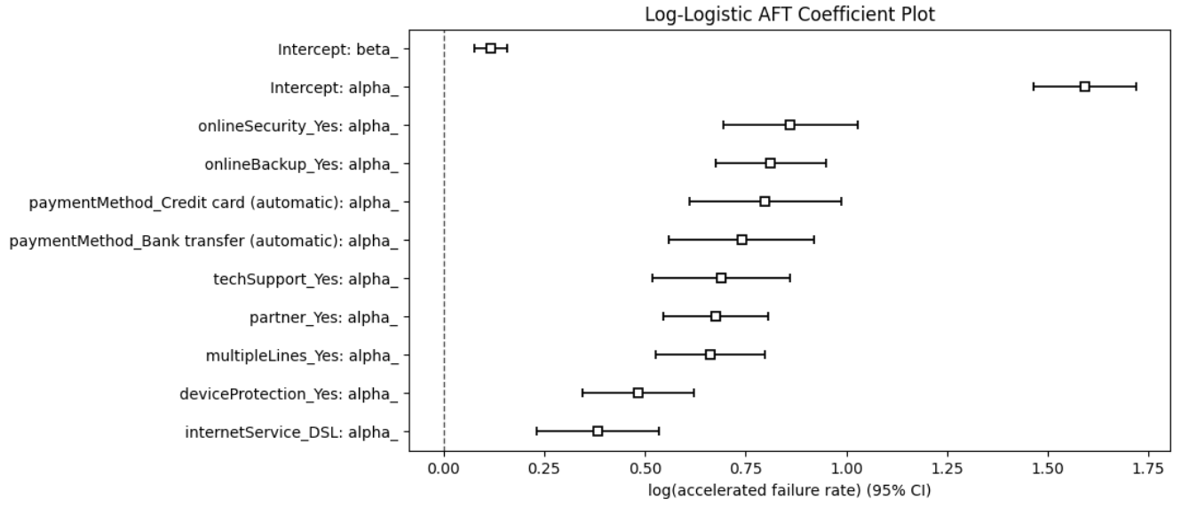 The AFT model included one-hot encoded variables such as partner, multipleLines, internetService, onlineSecurity, onlineBackup, deviceProtection, techSupport, and paymentMethod. Several coefficients were strongly associated with longer retention time, especially onlineSecurity_Yes, onlineBackup_Yes, paymentMethod_Creditcard(automatic), paymentMethod_Banktransfer(automatic), techSupport_Yes, and partner_Yes. Because their exp(coef) values are all above 1, these variables indicate a longer expected time until churn.