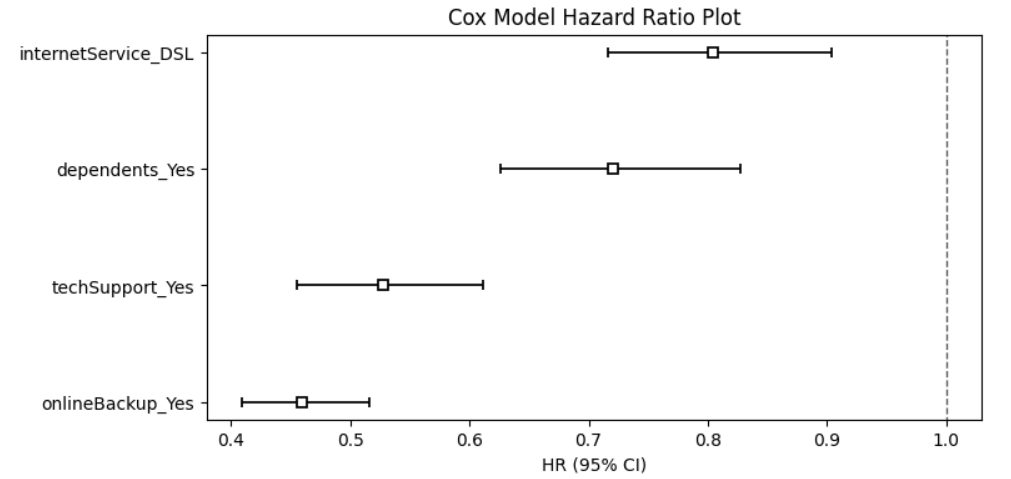 The final results indicate that four variables are especially important in explaining churn risk: dependents_Yes, internetService_DSL, onlineBackup_Yes, and techSupport_Yes. Their hazard ratios are all below 1, indicating that these variables are associated with a lower risk of churn. Among them, onlineBackup_Yes and techSupport_Yes show the strongest protective effects, suggesting that support-related service features are particularly important for customer retention. By comparison, dependents_Yes and internetService_DSL are also linked to lower churn risk, but their effects are more moderate. These findings are also consistent with the earlier Kaplan-Meier analysis, where service-support variables showed especially clear group differences.