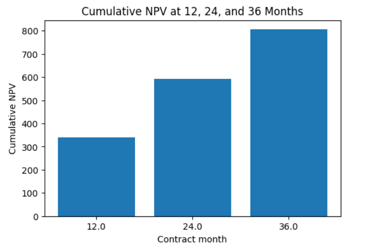 The cumulative discounted value still continues to grow over the medium term. For the sample customer, the cumulative net present value was approximately 339.09 at 12 months, 593.35 at 24 months, and 805.24 at 36 months. This suggests that even though churn risk increases over time, customers can still generate substantial discounted value as long as their survival probability remains reasonably high in the earlier periods.
