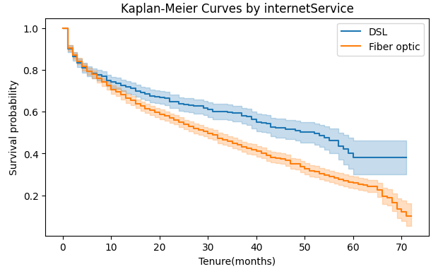 Among the significant variables, service-support features were especially informative. Figure 2 presents four representative grouped Kaplan-Meier survival curves for internetService, onlineSecurity, onlineBackup, and techSupport. The curve for internetService shows a significant difference between DSL and Fiber optic customers, indicating that different service types are associated with distinct retention patterns. The remaining three plots all show clear separation between groups: customers who used onlineSecurity, onlineBackup, or techSupport consistently maintained higher survival probabilities and stayed active longer through most of the contract horizon.