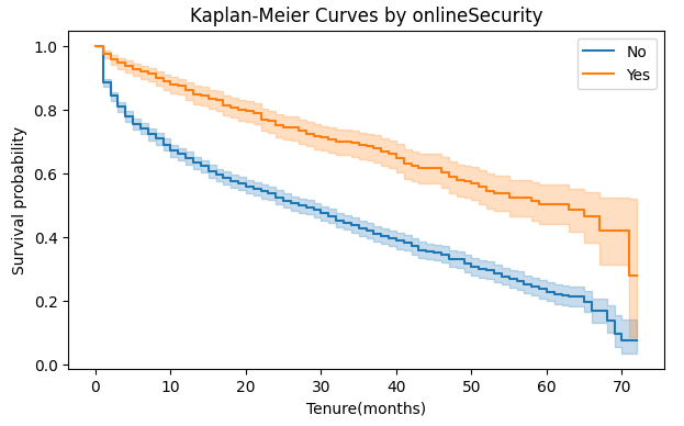 | onlineSecurity_Yes | 0.86 | 2.37 | <0.005 | strongly prolongs retention time |