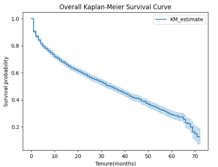 The Kaplan-Meier estimator was first used to describe the overall retention pattern of the filtered customer cohort, where tenure is treated as the duration variable and churn is the event variable. For the full sample, the estimated median survival time was about 34 months, indicating that roughly half of the customers in the filtered cohort were expected to churn by around month 34. The overall survival curve declines steadily over time, suggesting that churn risk accumulates gradually rather than occurring at a single time point.