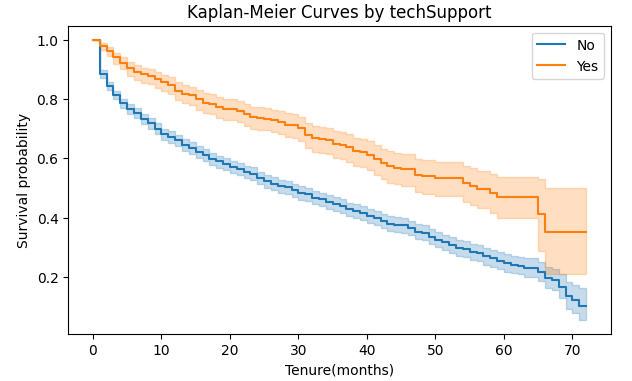 | techSupport_Yes | 0.69 | 1.99 | <0.005 | strongly prolongs retention time |